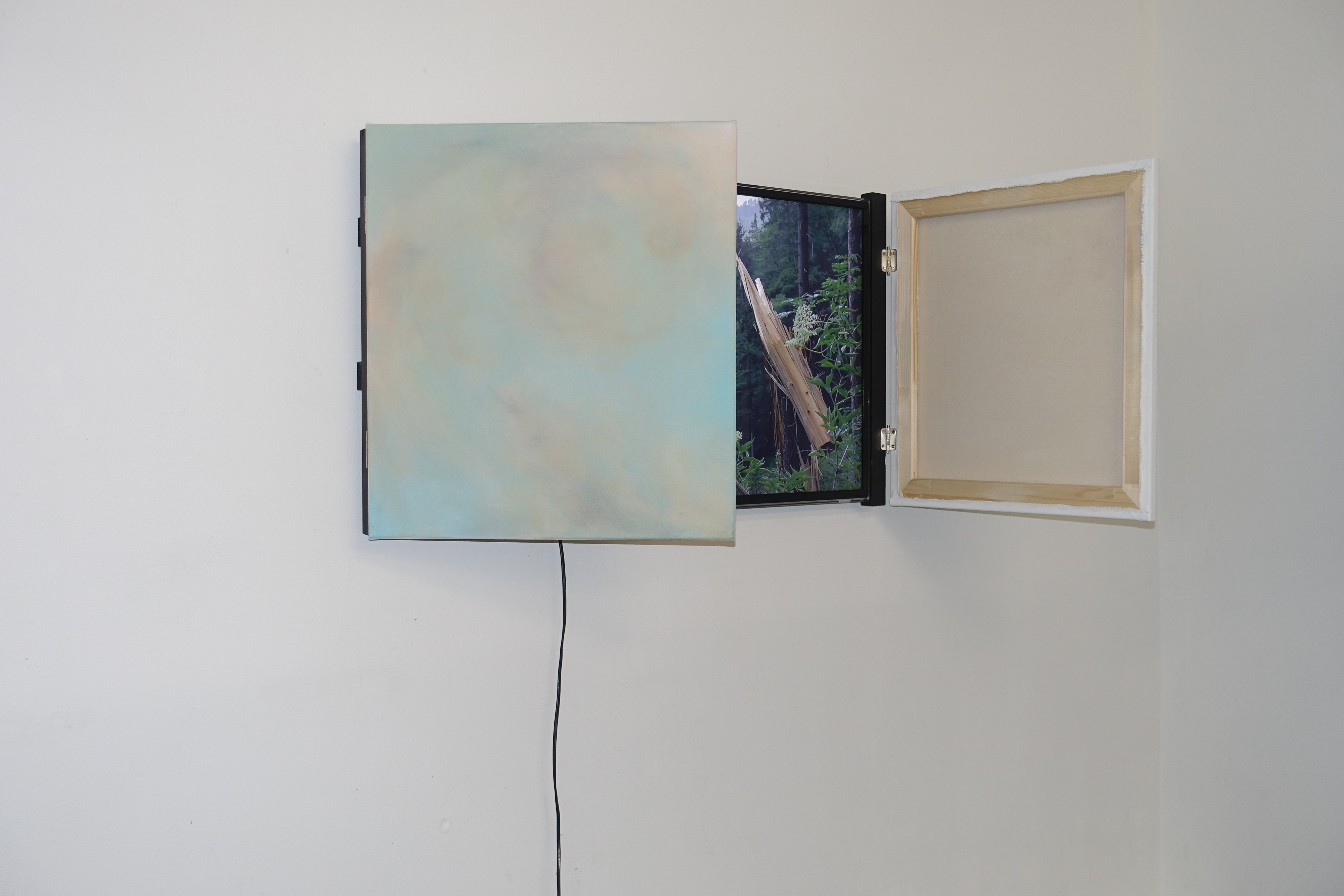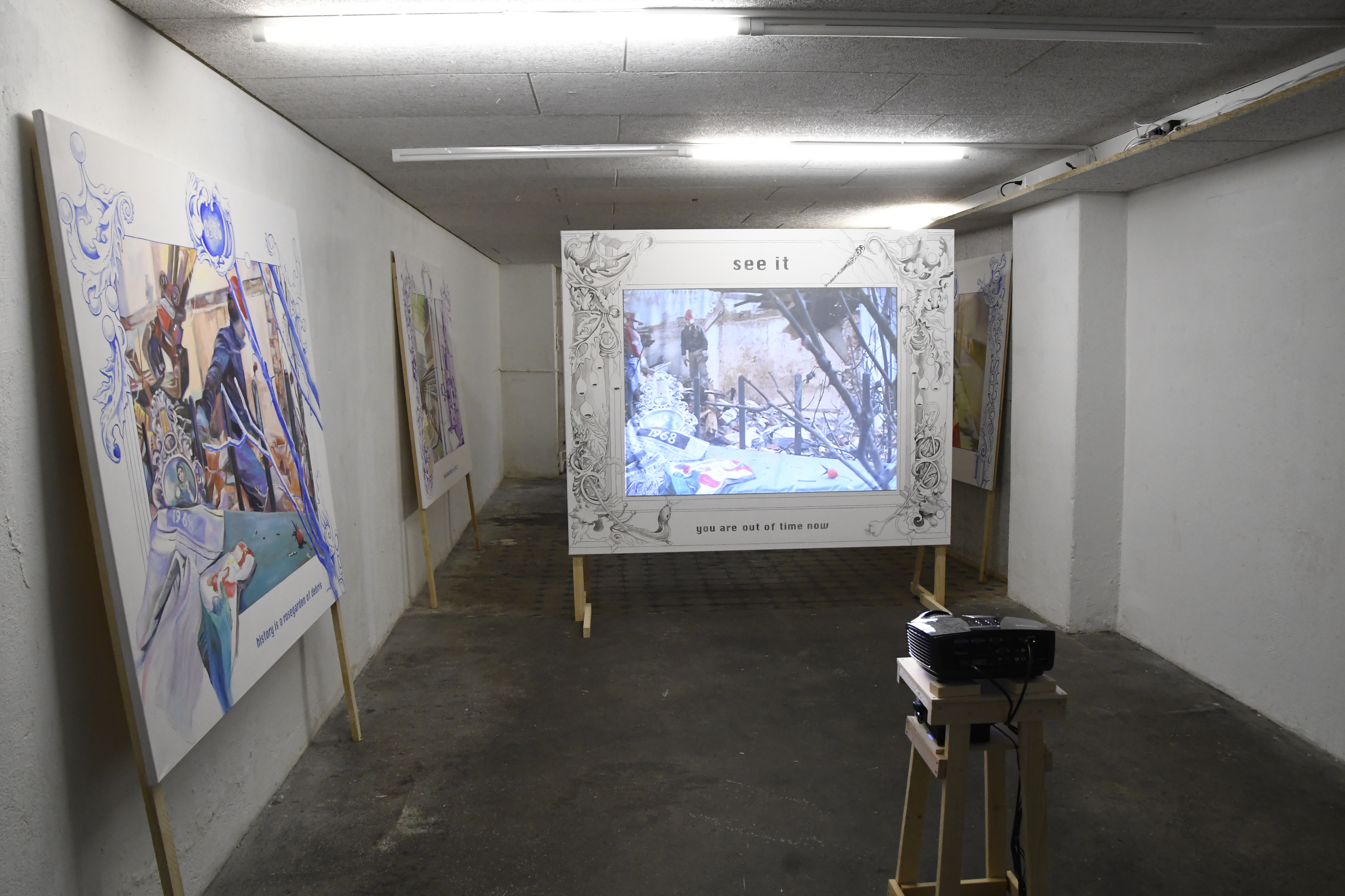 Den bewegten Bildern der Videoprojektion gegenübergestellt sind Malereien. Dauerhafte Rückübersetzung eines einzelnen Frames aus einer Stunde des kurzlebigen Mediums Video.